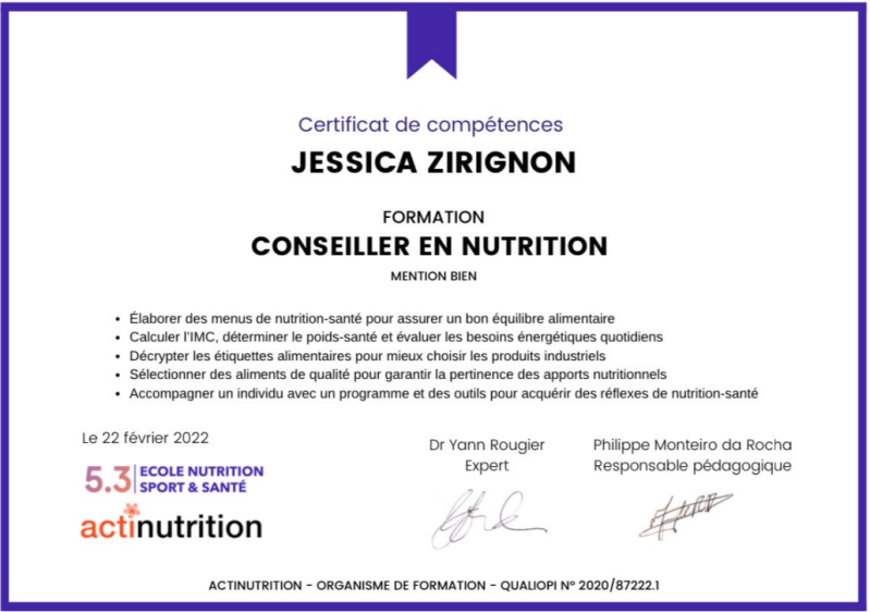 J'ai donc suivi une formation certifiante reconnue par l’Etat pour devenir conseillère en nutrition et bien-être afin d'aider un maximum de personnes à perdre du poids grâce à un réequilibrage alimentaire.
